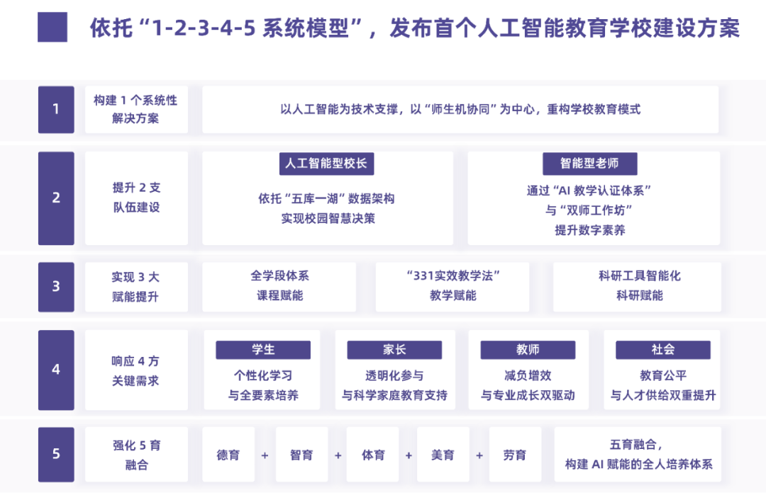华领通智推出的AI水手,则是以“人工智能教育学校建设方案”帮助学校实现深层变革。该方案提出“1-2-3-4-5 系统模型”,通过以“师生机协同”为核心的一个系统性解决方案,提升“人工智能型校长”与“智能型教师”两支队伍的数字素养,实现课程、教学、科研三大维度赋能,响应学生、家长、教师、社会四方需求,强化“德智体美劳”五育融合,构建AI赋能的全人培养体系。